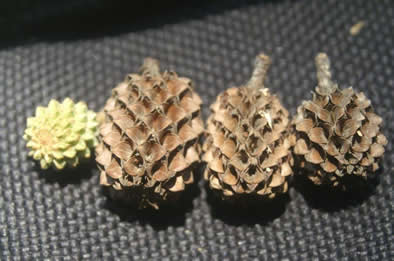 果實:集生成小毬果,橢圓形,苞片木質化,裂開放出有翅種子(傳播:風力)。