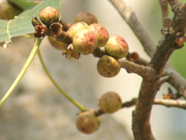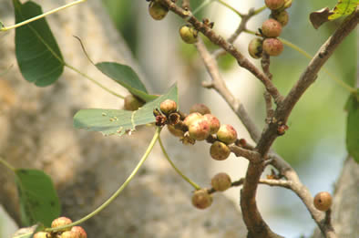 夏季時樹幹上成對出現無梗的扁球形隱花果。隱頭花序,雄花、雌花和不育花(癭花)均生長在同一榕果的內壁。果實為直徑1-1.5厘米的小無花果,成熟時顏色由綠色變為紫色。
